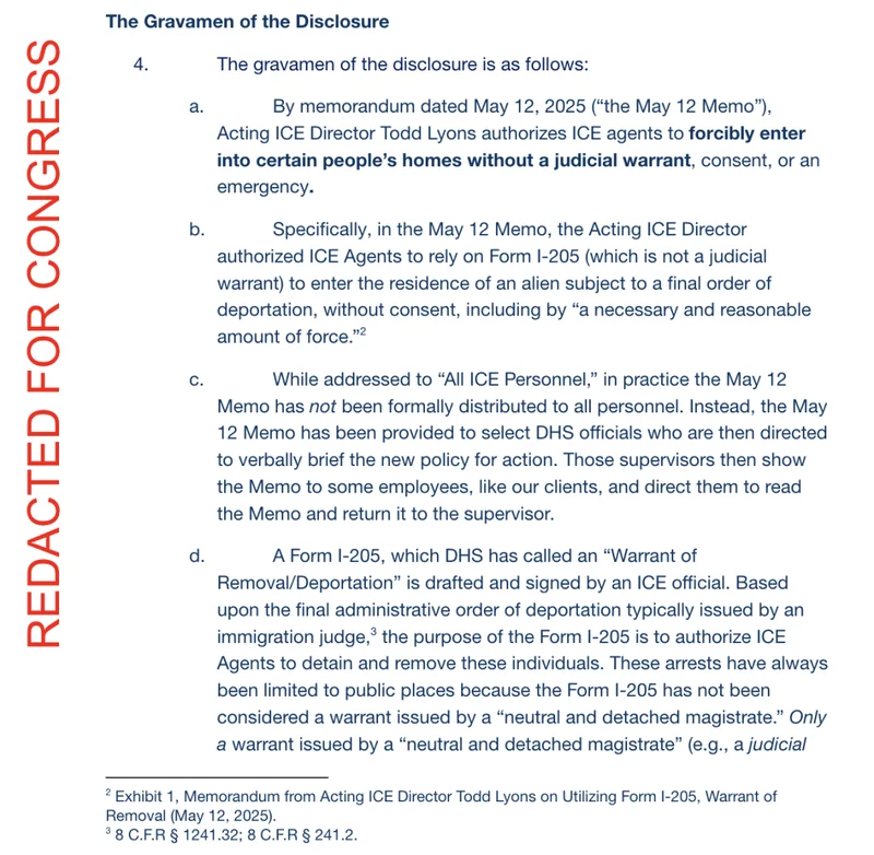 内部人员爆料:这份备忘录是2025年5月12日出台的,ICE代理局长托德·莱昂斯(Todd Lyons)授权ICE 在未取得司法搜查令、未获得住户同意、且不存在紧急情况的情况下,强行进入某些人的住宅。