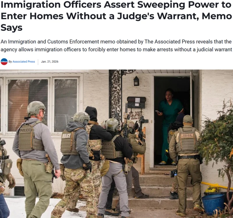 2026年1月21日,一份美国移民与海关执法局 (ICE) 的内部备忘录被曝光:ICE 特工被授权在没有法官签发“司法搜查令”的情况下,仅凭一份“行政逮捕令”即可强行进入居民住宅执法。维权人士指出,这一做法与美国宪法第四修正案的保护精神背道而驰,彻底打破了多年来联邦执法部门与移民社区之间的权利边界。