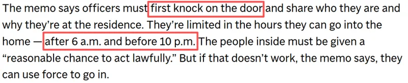 不过,备忘录也设置了一些“入门规则”:特工在进入住宅前需“敲门并声明身份”,说明执法目的,并给予屋内人员时间遵守命令。