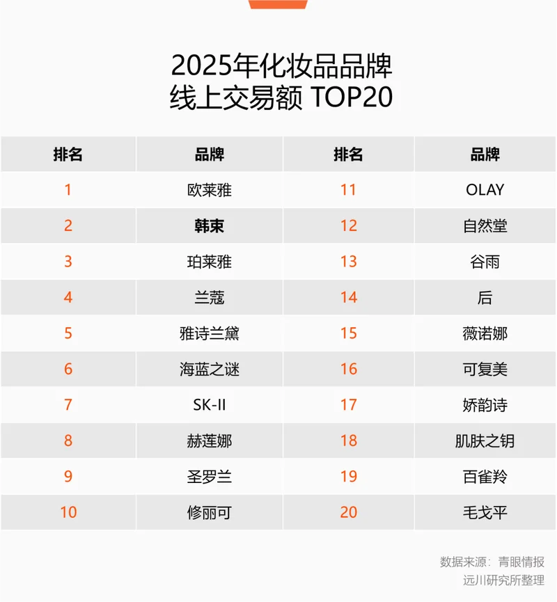 2023年,韩束和抖音主播合作的短剧爆红,8月起韩束冲上抖音美妆榜首,开启长达14个月的霸榜。2025年,韩束抖音GMV的保持双位数增长。青眼数据显示,2025年化妆品线上交易额排行榜中韩束位居第二,仅次于欧莱雅[1]。