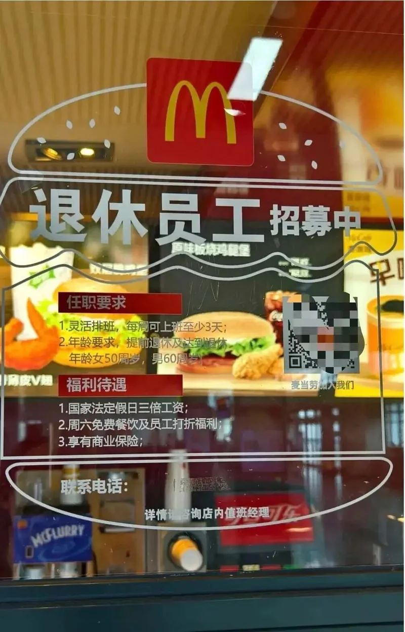 麦当劳打出宣传语“退休员工招募中”,任职要求为:每周可上班至少3天、提前退休及达到退休年龄(女50周岁、男60周岁)。还享有国家法定假日三倍工资、周六免费餐饮及员工打折福利、享受保险。