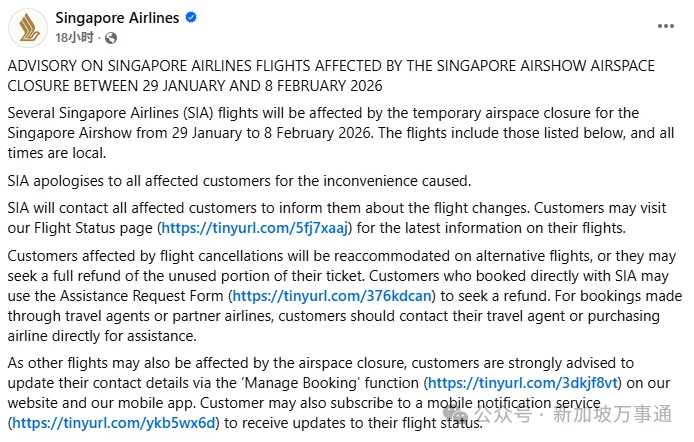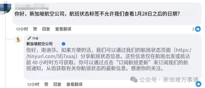 图源:FB@Singapore Airlines消息一经公布,就有网友吐槽说:新航网站只能查48小时内的航班变化,没法提前知晓行程?新航也马上回应了:大家可以订阅航班更新提醒,后续航班有任何变动,都会第一时间通知到你。