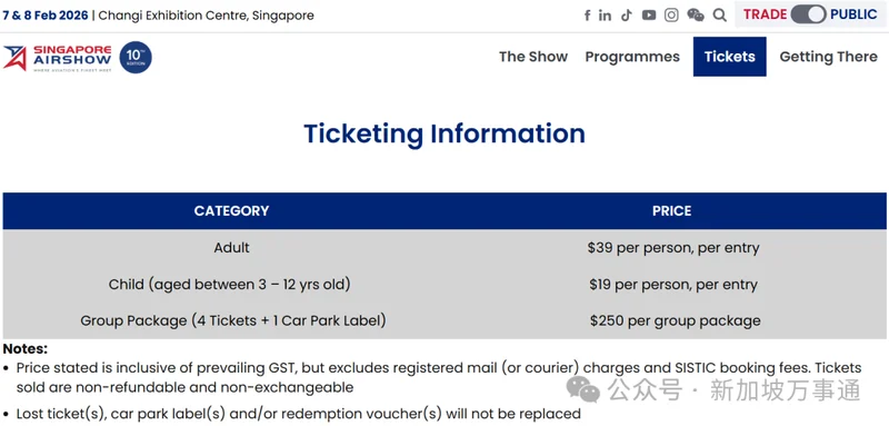 周末航展门票现已在SISTIC上发售,大家可以前往以下链接购买:https://www.sistic.com.sg/events/知的,也可以去新加坡航展官网查: