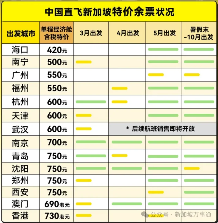 从中国海口、南宁、广州、福州、杭州、天津、武汉、南京、青岛、沈阳、郑州、西安、澳门、香港等城市直飞新加坡,价格低至420元(约76新元)~