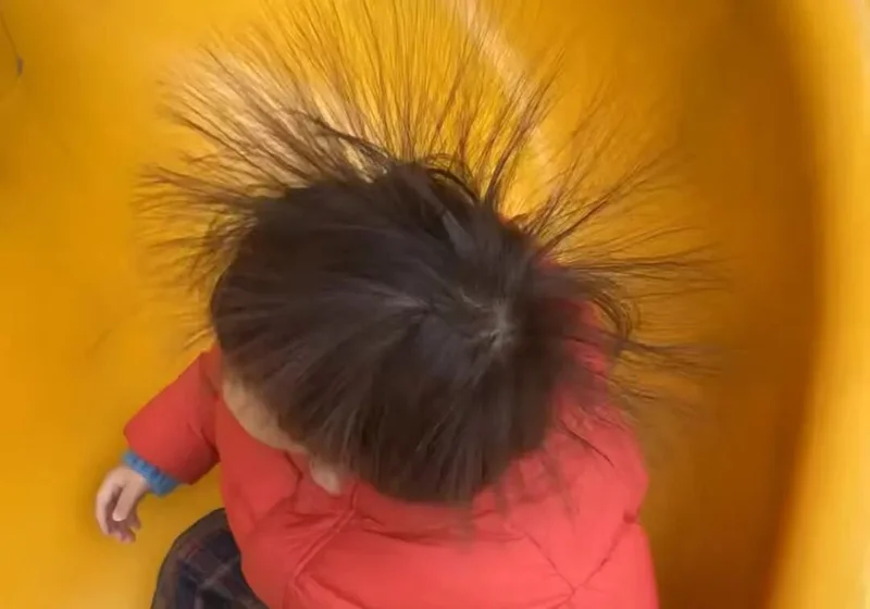 小孩子从滑梯向下滑,摩擦产生的静电让头秒变“海胆” / 图源博主@吕太一和他的弟弟 已获得授权