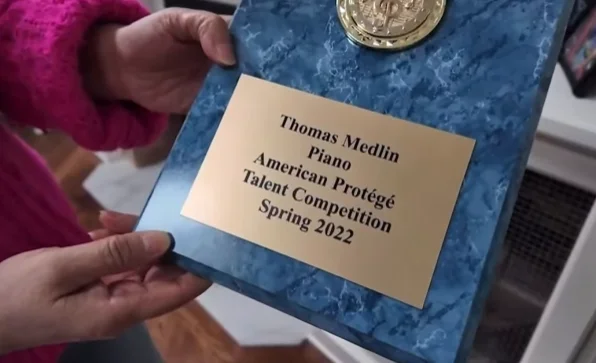 他成绩优秀,喜欢音乐、艺术与体育,2022年孩子还在钢琴比赛中获奖,一本Thomas平时练习的中文字帖中字体工整。
