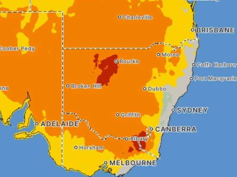 目前受影响的重点地区包括Broken Hill、Bourke、Dubbo、Moree、Orange、Tamworth、Wagga Wagga、Albury和Deniliquin。