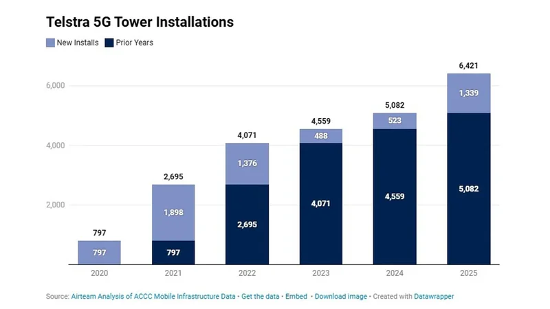 Telstra新增的5G基站安装量在2024年至2025年间翻了一倍多。来源:Airteam