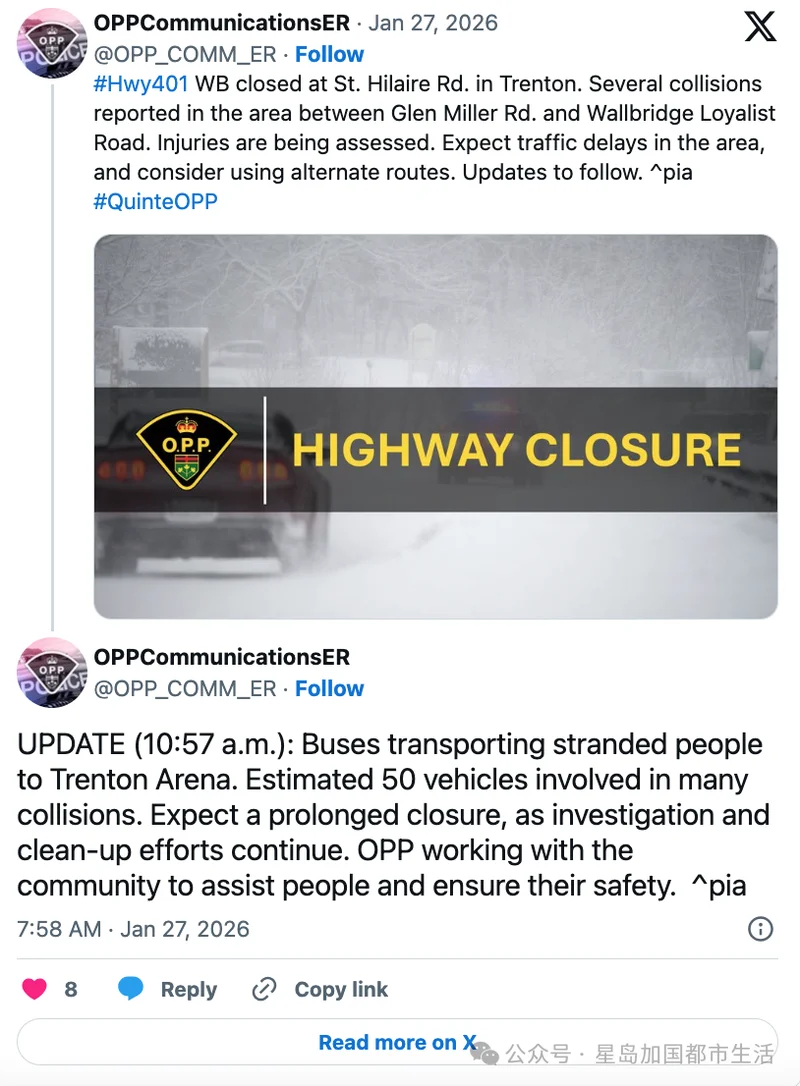 警方也指出,这已是本月内401号公路第二次因暴风雪出现大规模事故。1月15日,湖效应大雪吹袭期间,401号公路近布 Brockville的Lansdowne至Mallorytown一段,也曾发生涉及至少20辆车的严重车祸,导致数百名司机被困,其中一名儿童需送院治理重伤。省警再次提醒,冬季驾驶风险极高,恶劣天气下应避免不必要出行,并密切留意最新路况。