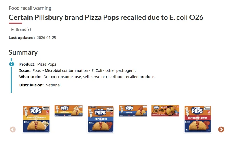 作为一种既能用微波炉、烤箱,也能用空气炸锅加热的便捷食品,Pizza Pops 一直是不少家长给孩子准备餐食时的常见选择。没想到,继前段时间首次召回之后,又有十多款产品被陆续列入问题名单,让不少家长看了直呼眼前一黑。据 Global News 报道,加拿大食品检验局(CFIA)宣布将扩大对 Pillsbury Pizza Pops 产品的召回范围。这批产品被发现可能受到大肠杆菌 O26 污染,存在严重健康风险。