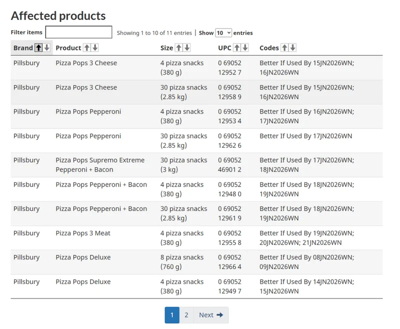 最新的召回通知涵盖了五种口味的 Pizza Pops 产品,每种口味有多种尺寸,目前召回的产品总数约为十二种。以下是最新的召回名单: