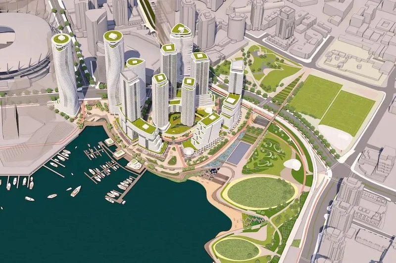 2025年,协平世博集团(Concord Pacific)更新其位于东北金融中心(NEFC)的10英亩地块——康科德登陆(Concord Landing)项目最新开发方案。该方案将大幅提高建筑密度,因为视野范围的变化使得建造更高塔楼成为可能。当时,开发商提交了一份预申请分区变更咨询,以期获得城市规划人员的意见,从而在未来可能提交的新分区变更申请之前完善该方案。