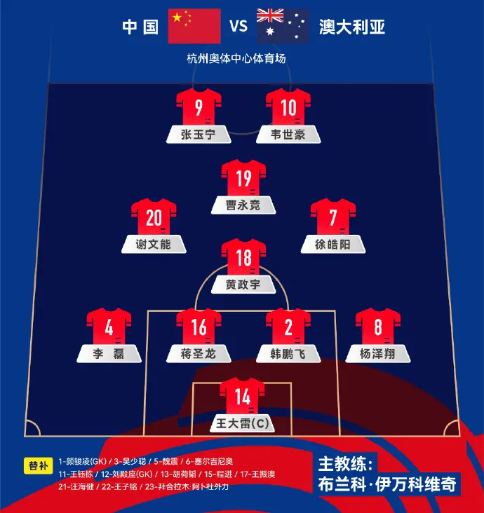 此役多名主力受伤,伊万科维奇在首发方面派上张玉宁和韦世豪出任锋线,黄政宇、曹永竞、徐皓阳以及谢文能组成中场,蒋圣龙、韩鹏飞、李磊以及杨泽翔搭档后防线,王大雷坐镇门前。